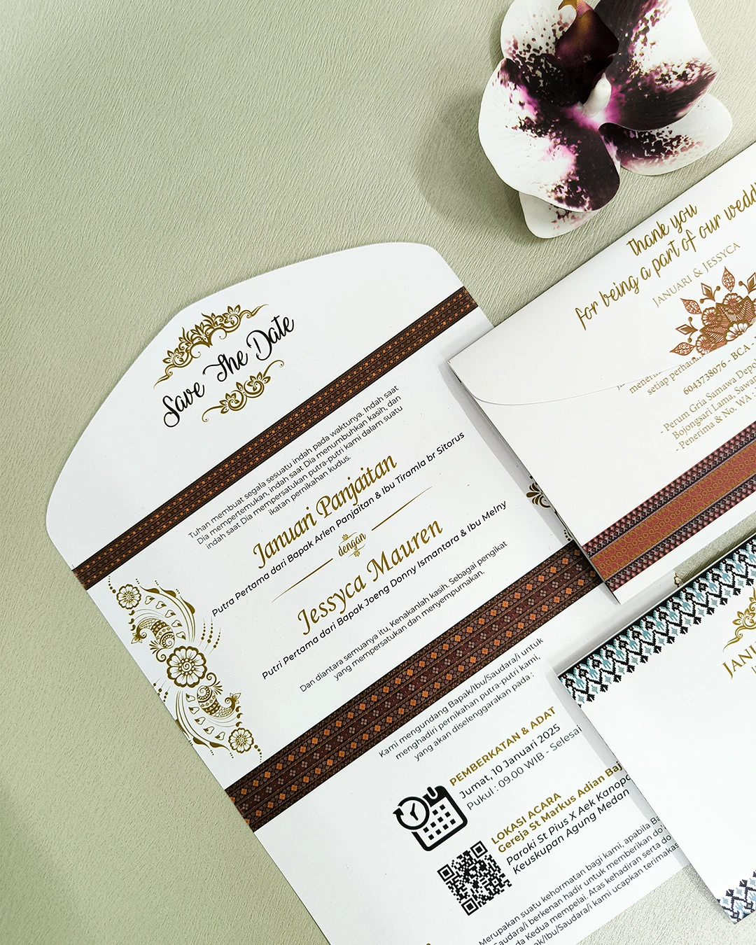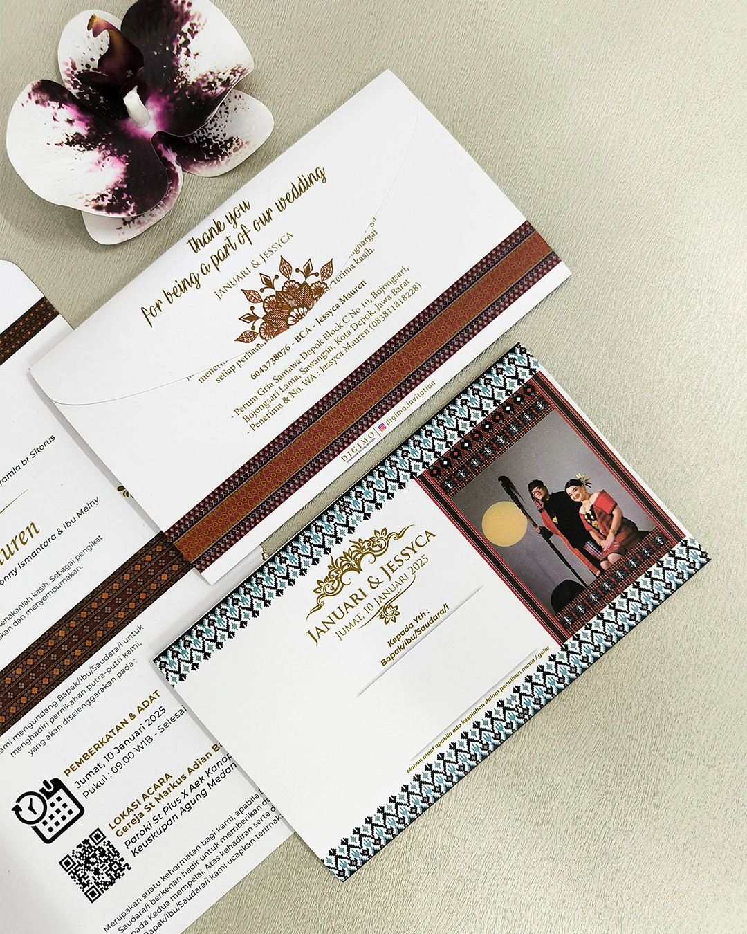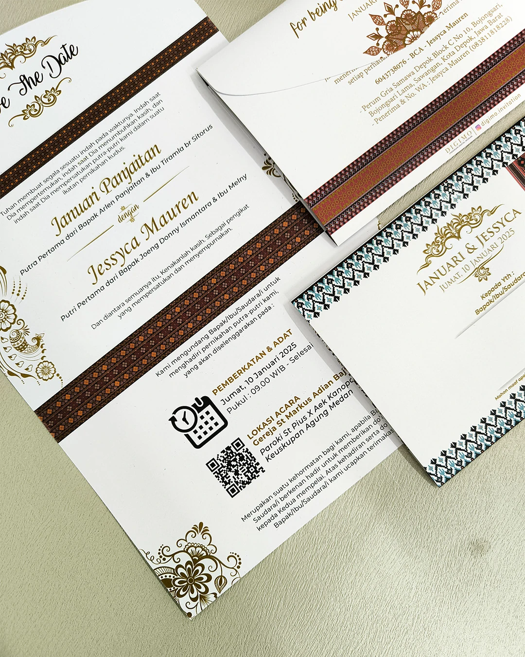 Sempurnakan undanganmu dengan berbagai opsi tambahan, mulai dari pengerjaan ekspress 5–7 hari kerja, thank you card, souvenir card, QR Check-in, finishing hot foil, upgrade jenis kertas dan laminasi, hingga custom design sesuai preferensimu. (dengan biaya tambahan).