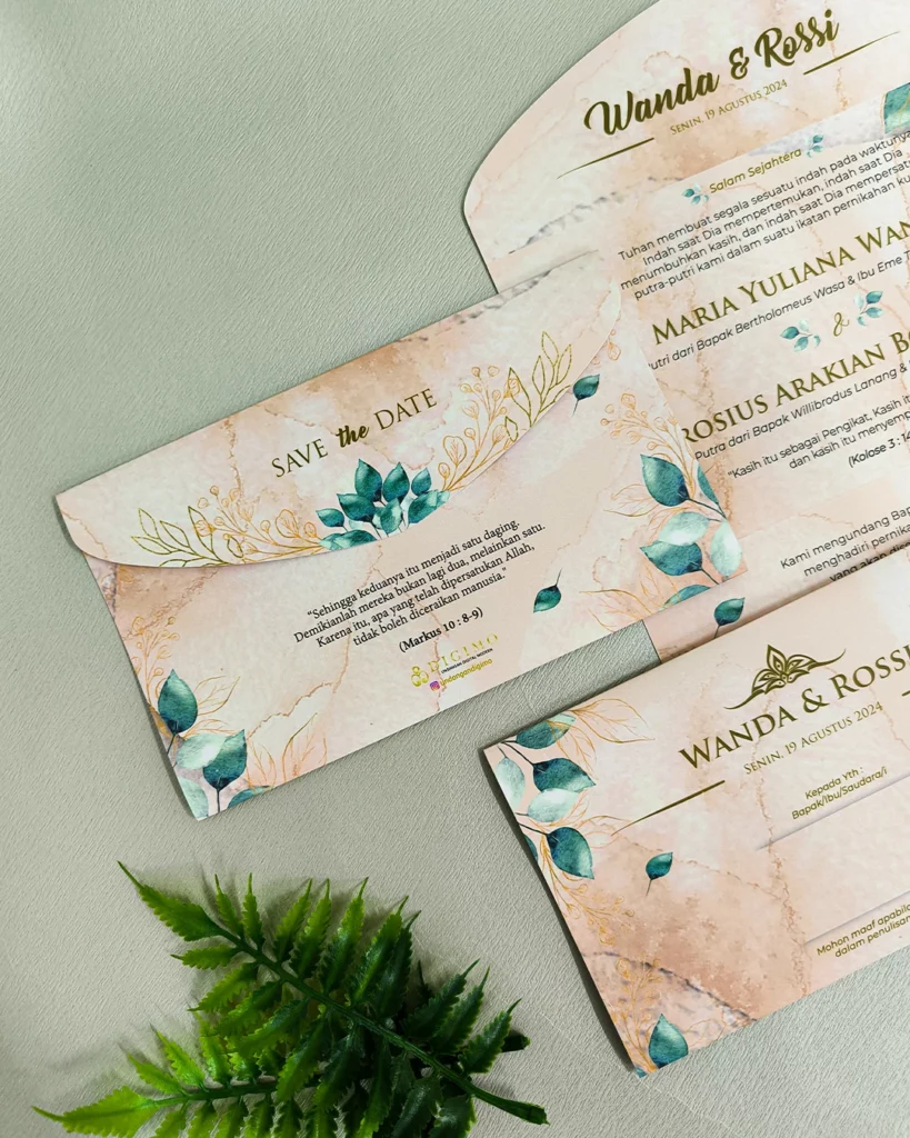 Blush Peach, harmoni nuansa peach lembut dengan sentuhan marble dan aksen daun hijau yang menghadirkan kesan hangat, romantis, dan elegan dalam tampilan yang modern serta menawan.