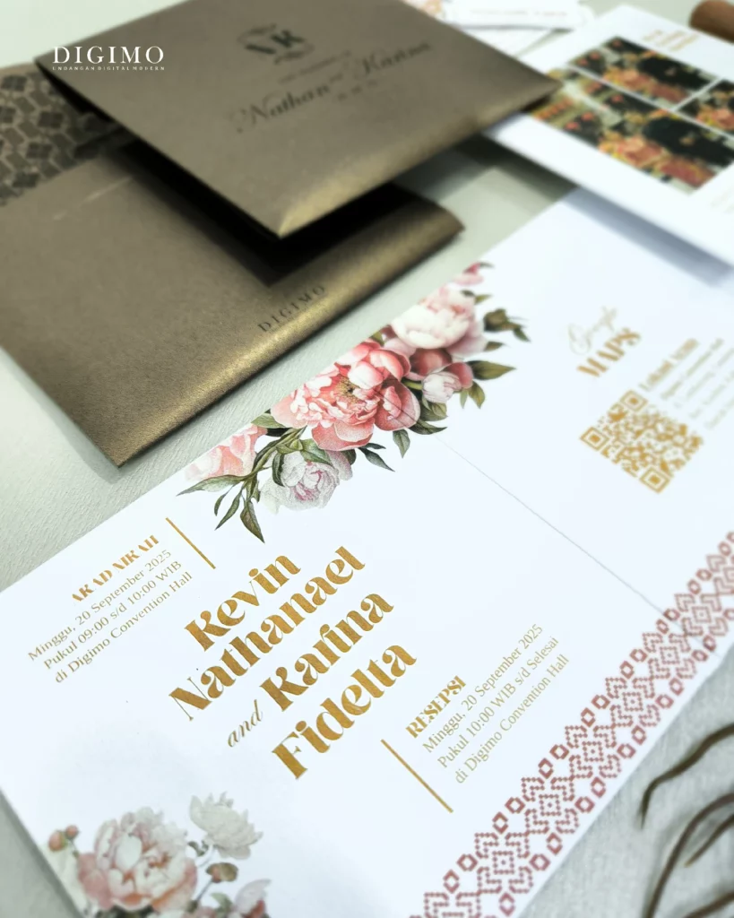 Sempurnakan undanganmu dengan berbagai opsi tambahan, mulai dari pengerjaan ekspress 5–7 hari kerja, thank you card, souvenir card, QR Check-in, finishing hot foil, upgrade jenis kertas dan laminasi, hingga custom design sesuai preferensimu. (dengan biaya tambahan).