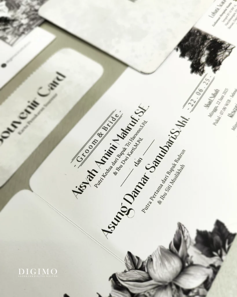 Sempurnakan undanganmu dengan berbagai opsi tambahan, mulai dari pengerjaan ekspress 5–7 hari kerja, thank you card, souvenir card, QR Check-in, finishing hot foil, upgrade jenis kertas dan laminasi, hingga custom design sesuai preferensimu. (dengan biaya tambahan).