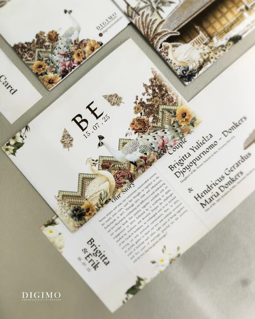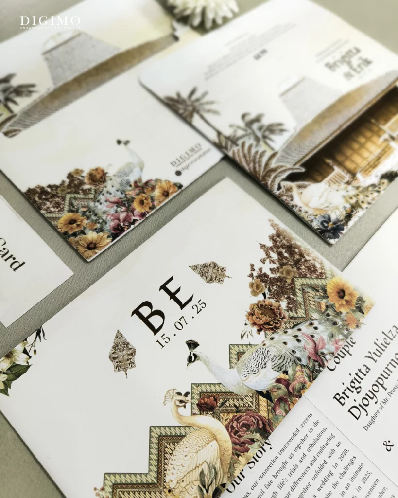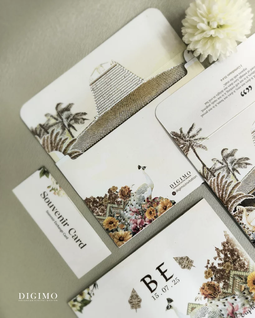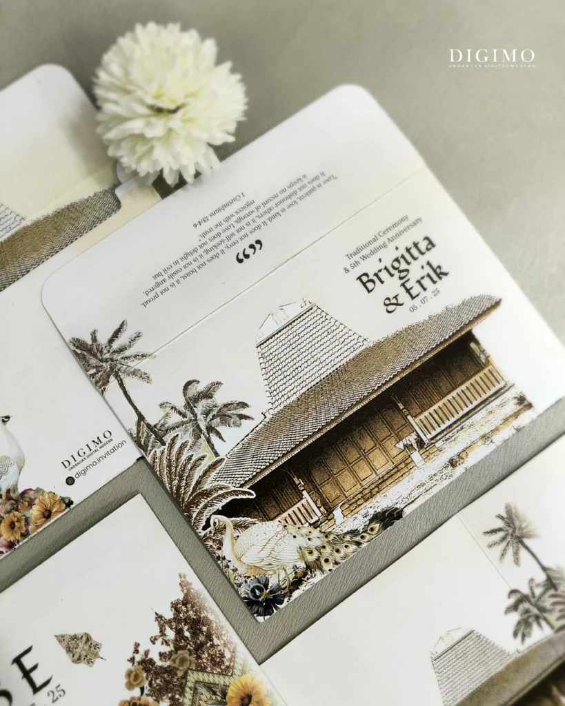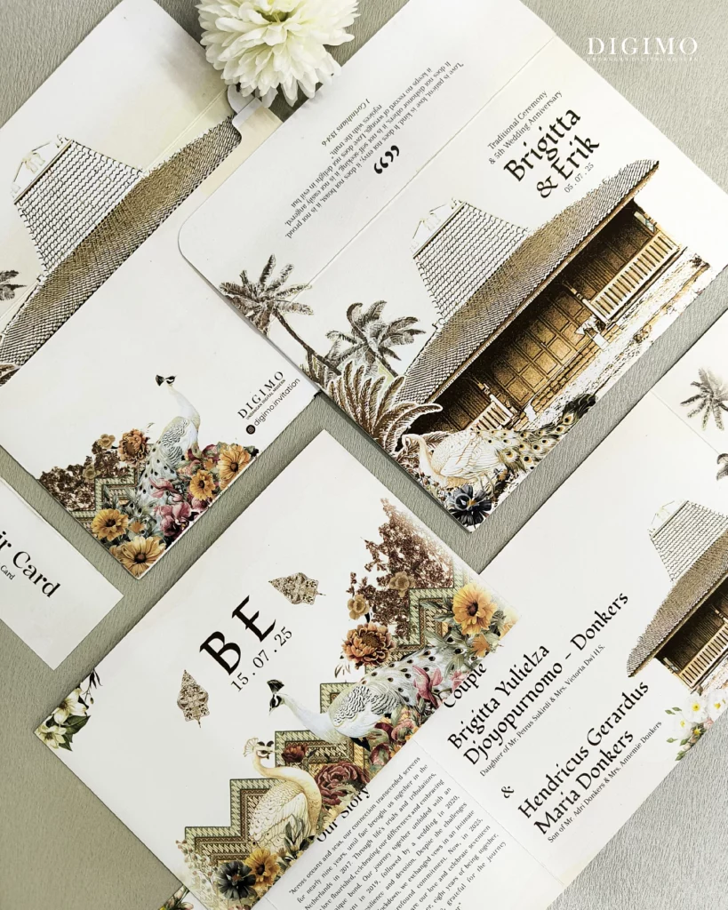 Javanese Heritage mengangkat adat Jawa dengan ilustrasi rumah adat dan ornamen floral yang hangat. Kesan alami dan klasiknya menghadirkan suasana sakral, tenang, dan berbudaya.