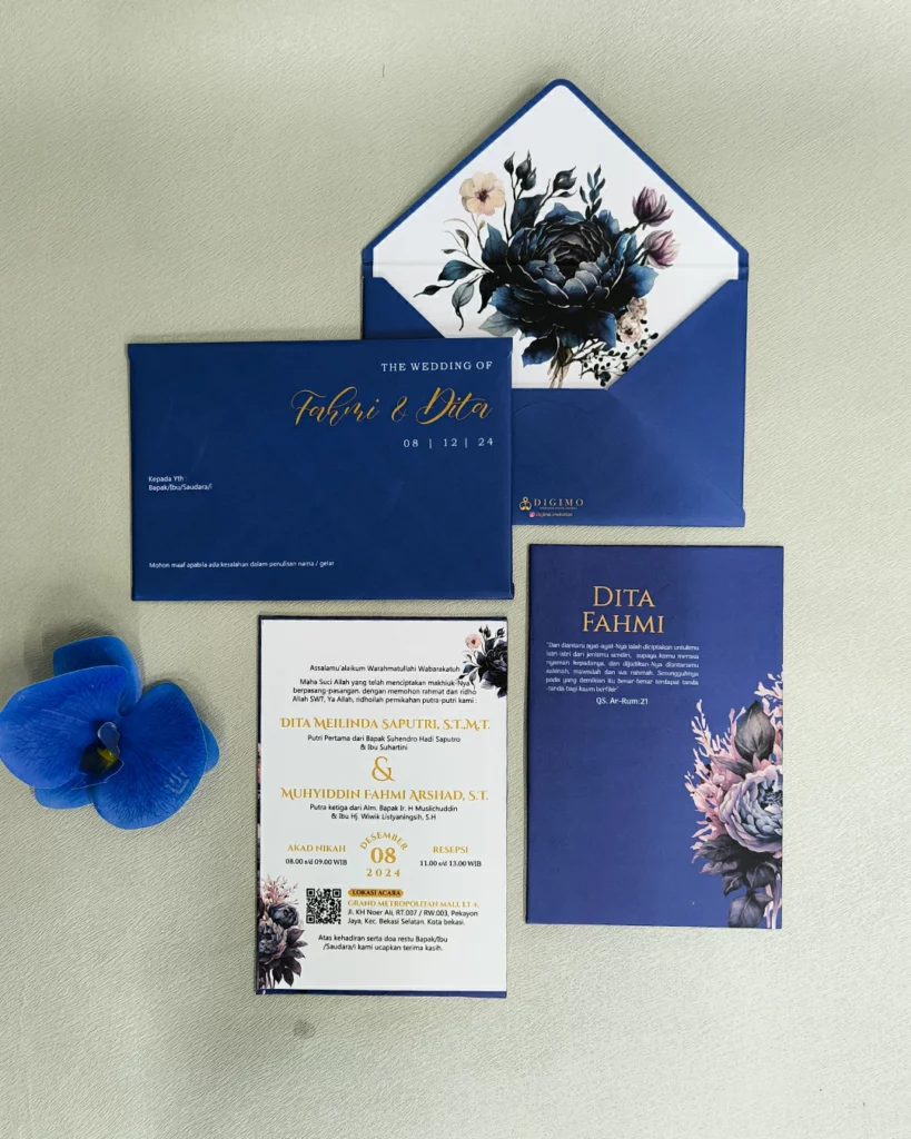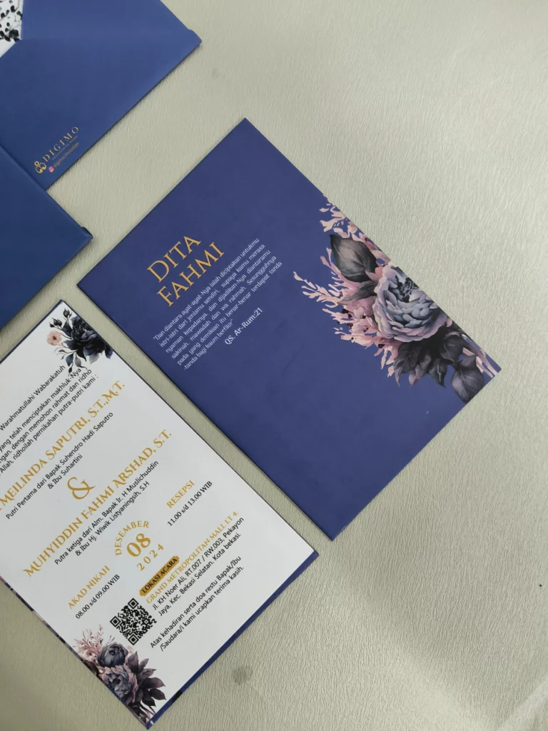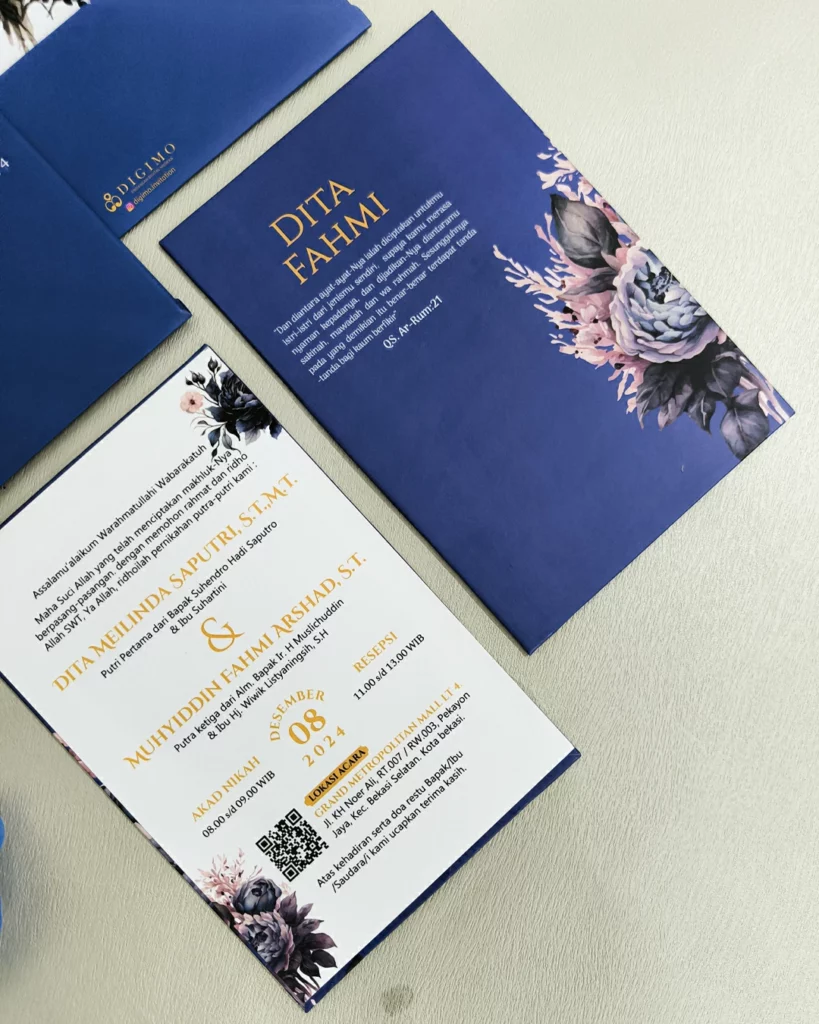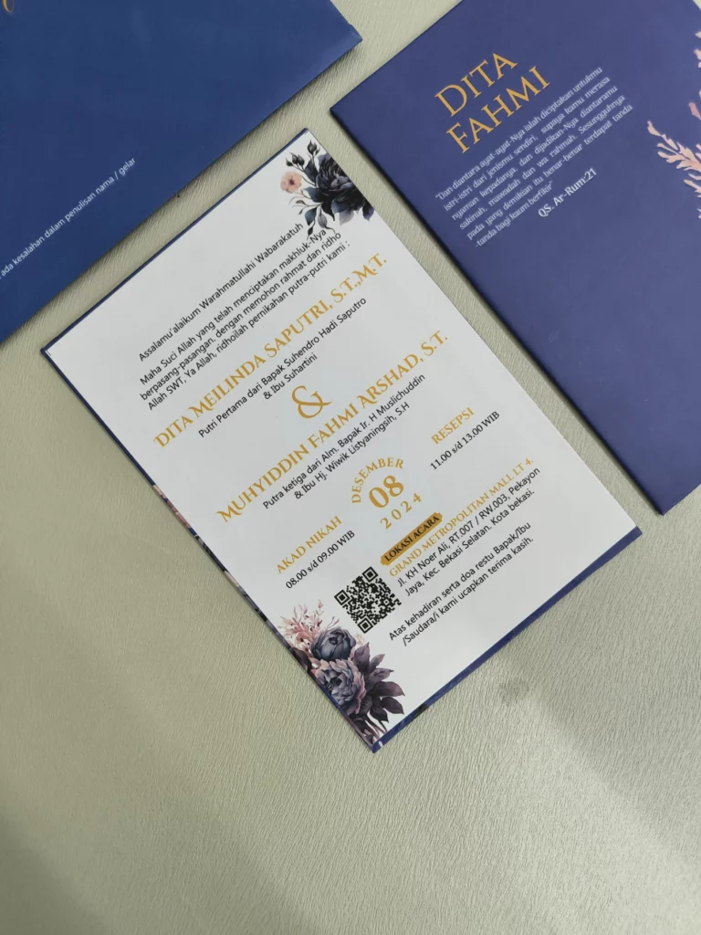 Sempurnakan undanganmu dengan berbagai opsi tambahan, mulai dari pengerjaan ekspress 5–7 hari kerja, thank you card, souvenir card, QR Check-in, finishing hot foil, upgrade jenis kertas dan laminasi, hingga custom design sesuai preferensimu. (dengan biaya tambahan).