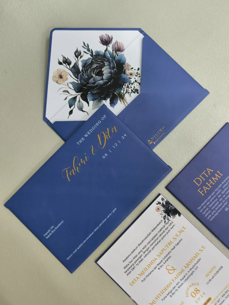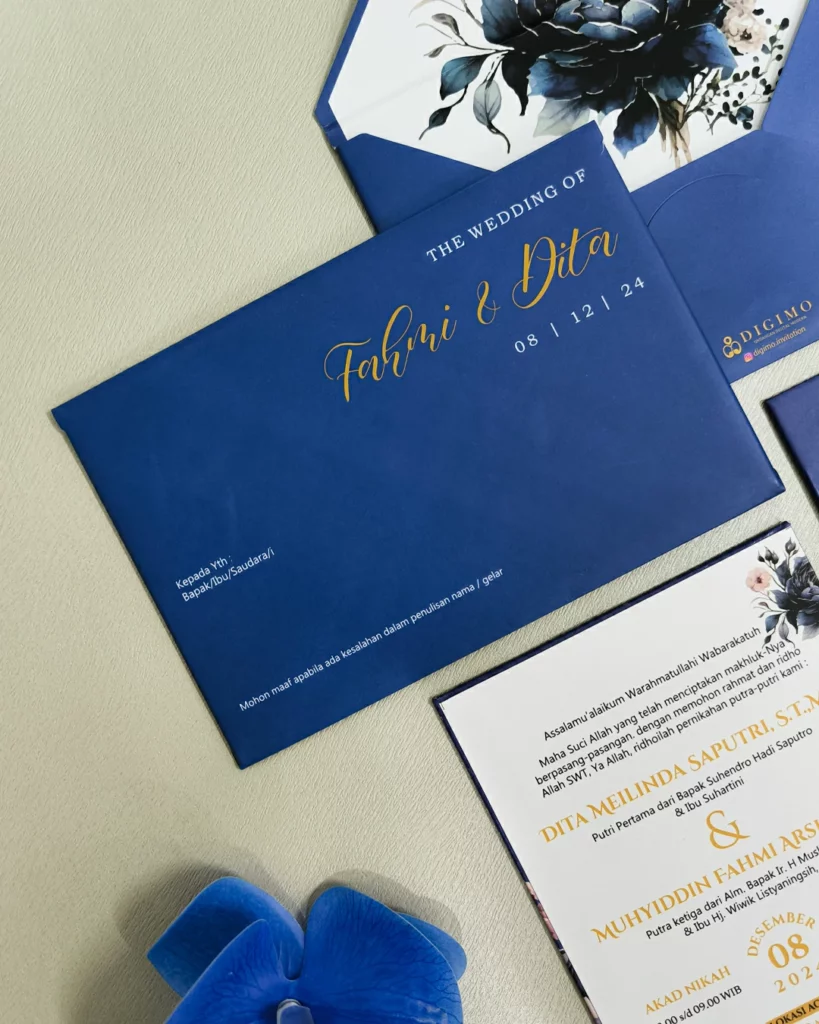 – Undangan cetak model amplop – Plastik OPP kemasan undangan – Label nama tamu + print nama tamu – Packaging pengiriman