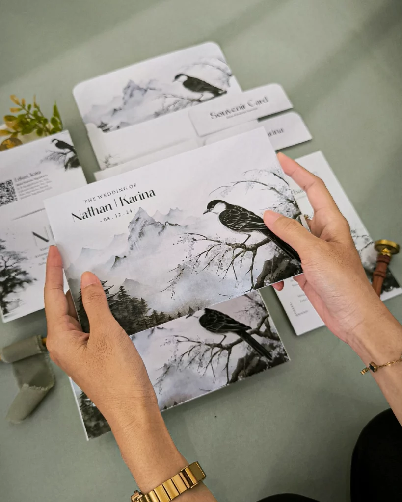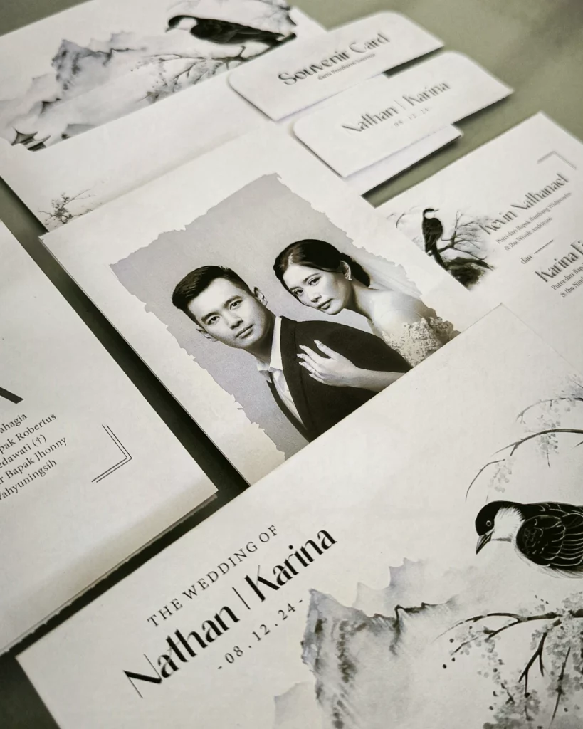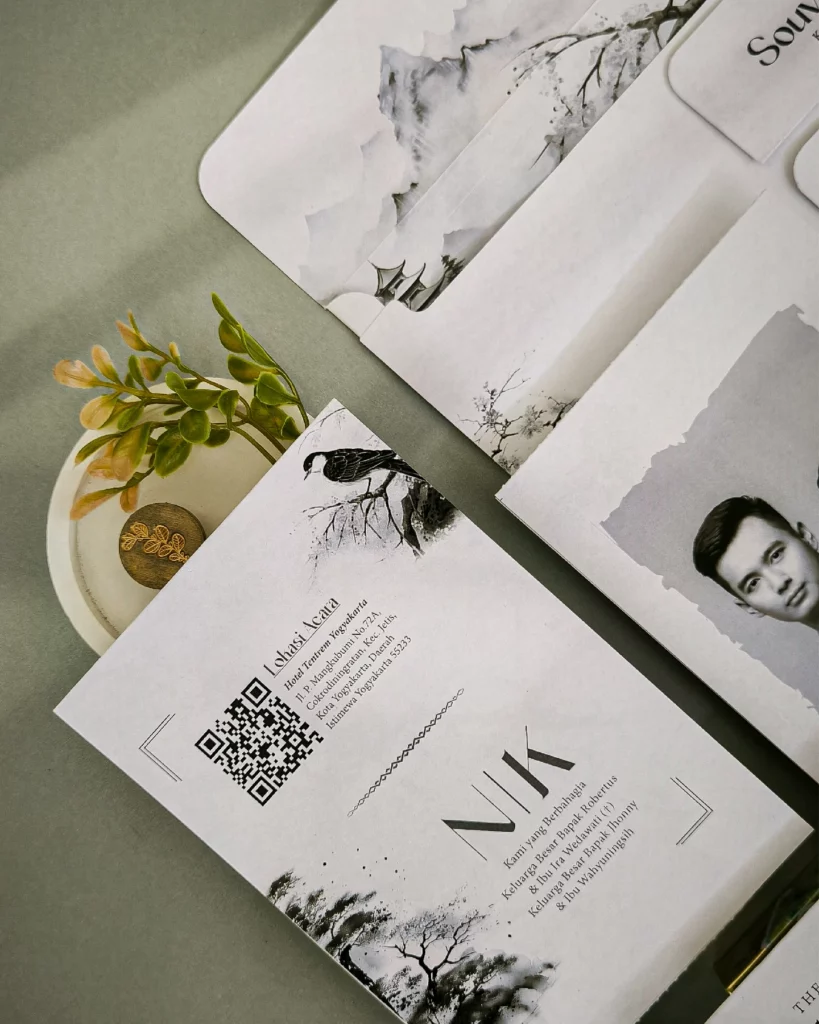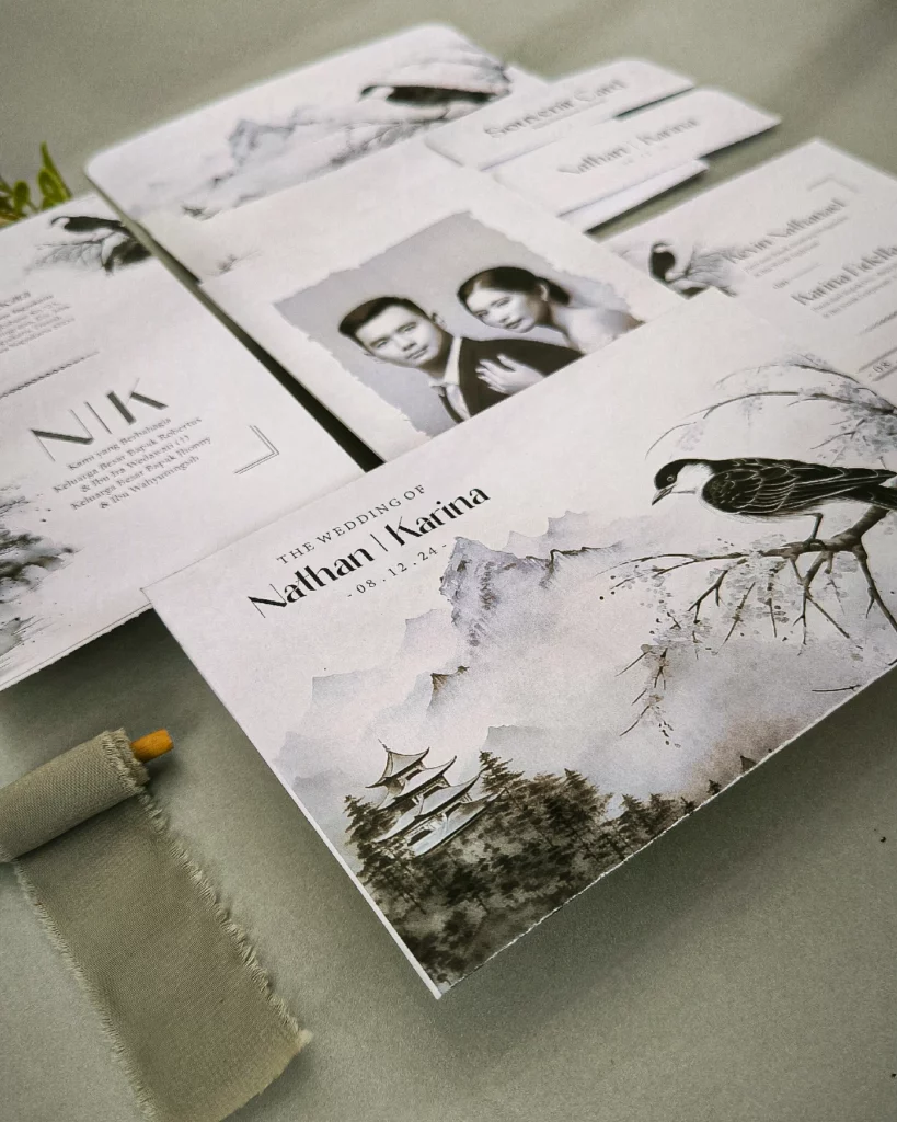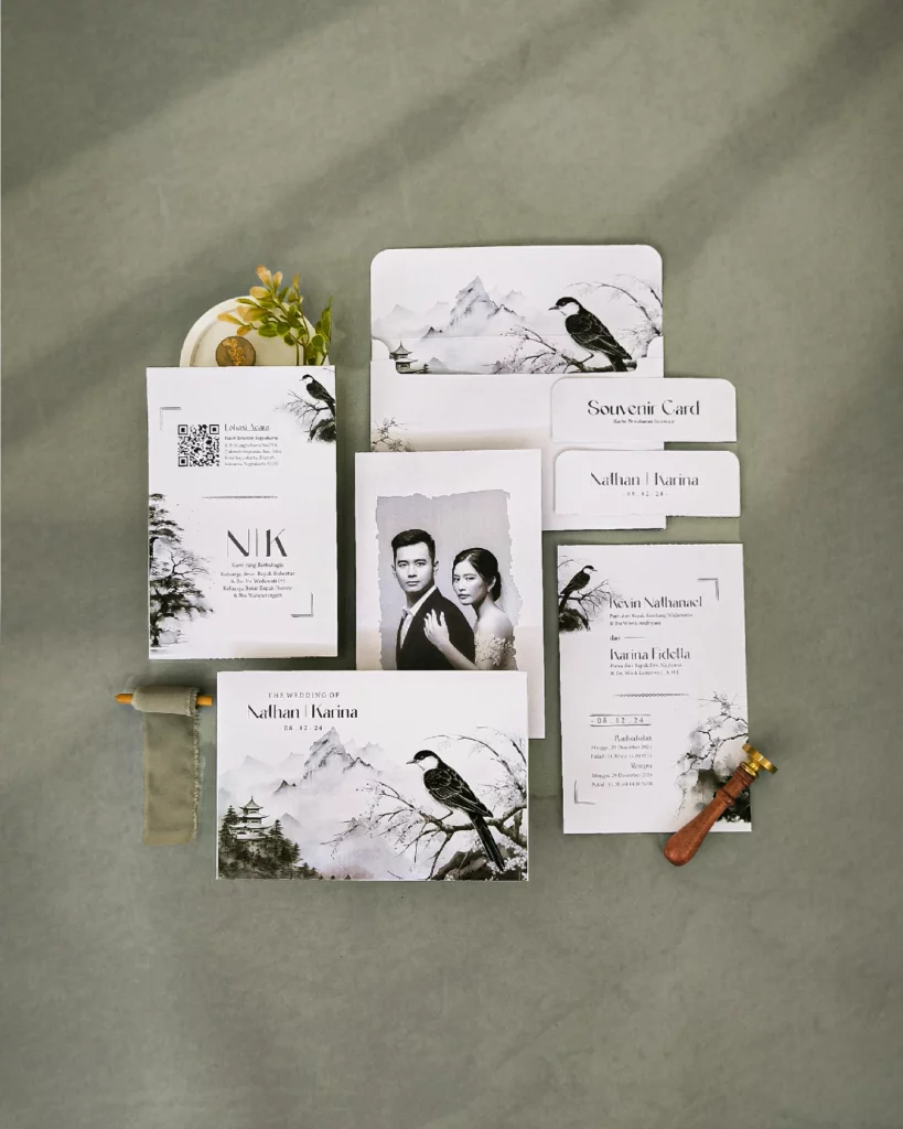 Obsidian mengusung ilustrasi monokrom dengan sentuhan landscape klasik dan siluet burung yang memberi kesan tenang dan artistik. Tampilan hitam putihnya bersih, minimal, dan terasa elegan dengan satu foto prewedding sebagai fokus personal.