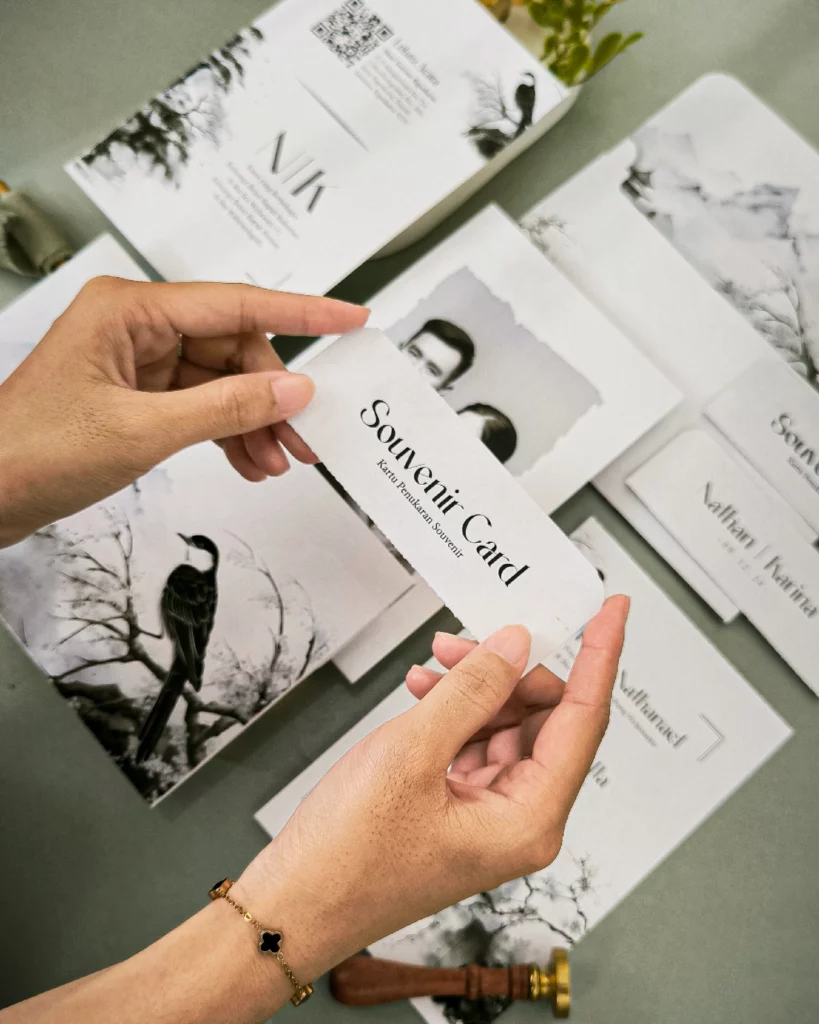 Sempurnakan undanganmu dengan berbagai opsi tambahan, mulai dari pengerjaan ekspress 5–7 hari kerja, thank you card, souvenir card, QR Check-in, finishing hot foil, upgrade jenis kertas dan laminasi, hingga custom design sesuai preferensimu. (dengan biaya tambahan).