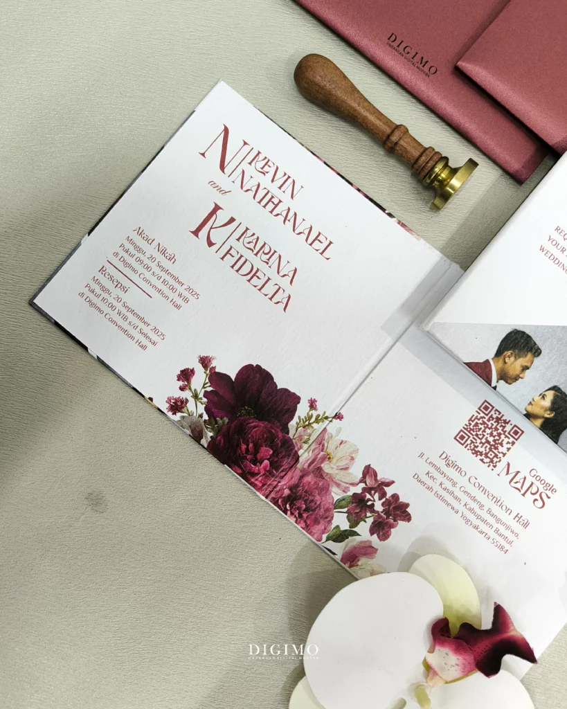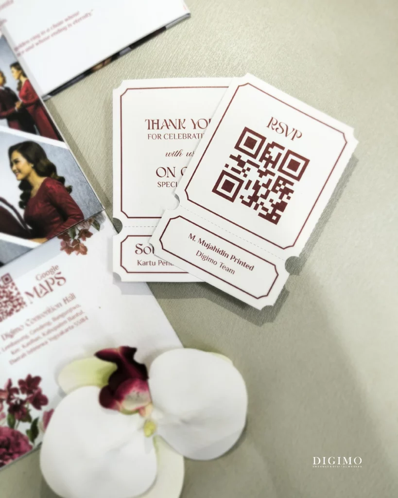 Sempurnakan undanganmu dengan berbagai opsi tambahan, mulai dari pengerjaan ekspress 5–7 hari kerja, thank you card, souvenir card, QR Check-in, finishing hot foil, upgrade jenis kertas dan laminasi, hingga custom design sesuai preferensimu. (dengan biaya tambahan).