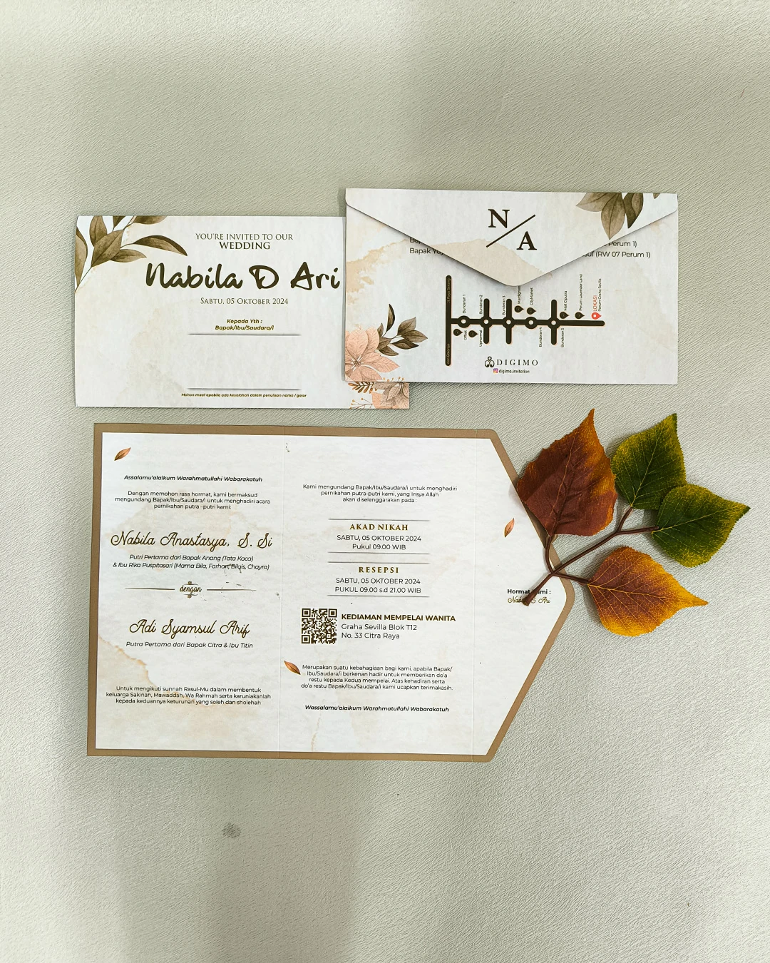 Rustic, perpaduan nuansa earthy dengan sentuhan daun kering dan palet cokelat hangat yang menghadirkan kesan natural, intimate, dan elegan dalam balutan desain yang sederhana.