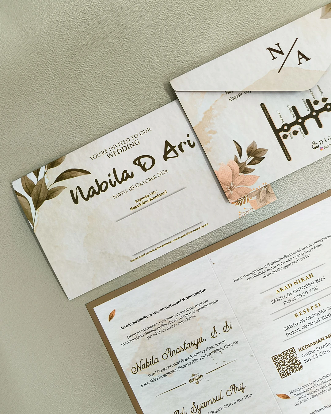– Undangan cetak Model B1 – Plastik OPP kemasan undangan – Label nama tamu + print nama tamu – Packaging pengiriman